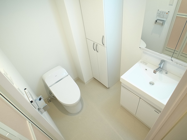 嬉しいウォームレット機能付きのトイレ、大きな洗面台、シューズクローゼットは本棚としてもご利用できます。備え付けで冷蔵庫、エアコン、洗面台、カーテン、照明、光インターネットを完備。デスクはありません。