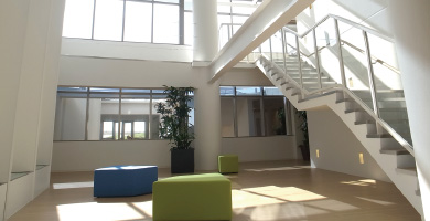 sideⅡの中央部は5階まで続く吹き抜けの空間。東西に配した全面ガラス張りの窓が、ひときわのびやかな空間を演出します。夜間にはライティングにより吹き抜けの縦のラインが浮かび上がり、スタイリッシュな表情を見せてくれます。壁には書き込みウォールなどを設置して、ホール全体が解放感あるコミュニティスペースとなっています。